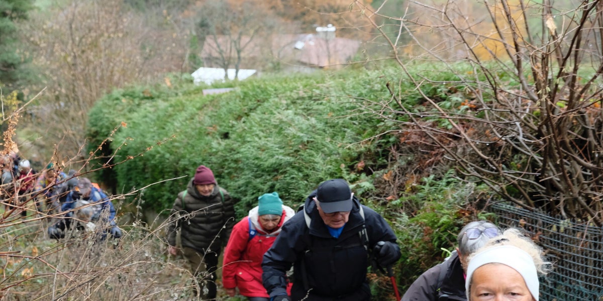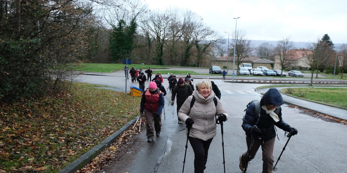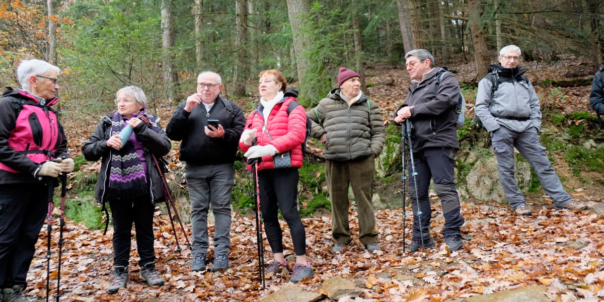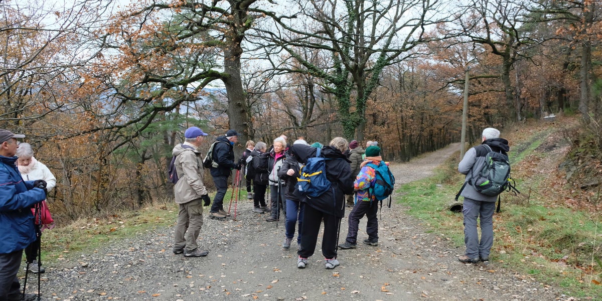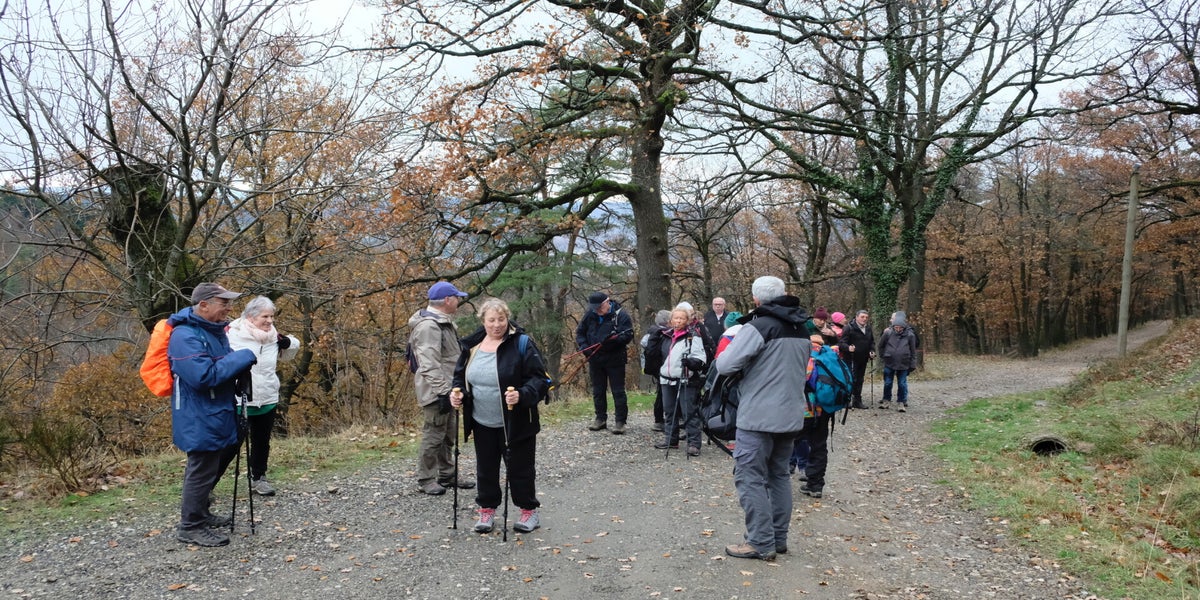 On y va on n’y va pas ?? Encore un jeudi maussade. A 13h30 sur le parking du PLCQ quelques gouttes de pluie, au loin un voile de brouillard recouvre le sommet des collines. Bref un temps peu propice à la marche. Mais c’est mal connaître les randonneurs du PLCQ… ce n’est pas un léger crachin ni l’air glacial qui va les empêcher de prendre le départ. La décision est prise il n’y aura qu’une seule marche mais il y aura une marche et ce sera le circuit des vertes collines. Finalement ils avaient raison ces 24 optimistes car en route pas une goutte de pluie que nenni. Les 9 km du circuit ont été avalés à vive allure sans avoir recours à la frontale eh oui nous n’étions pas à Valadon !! A la semaine prochaine