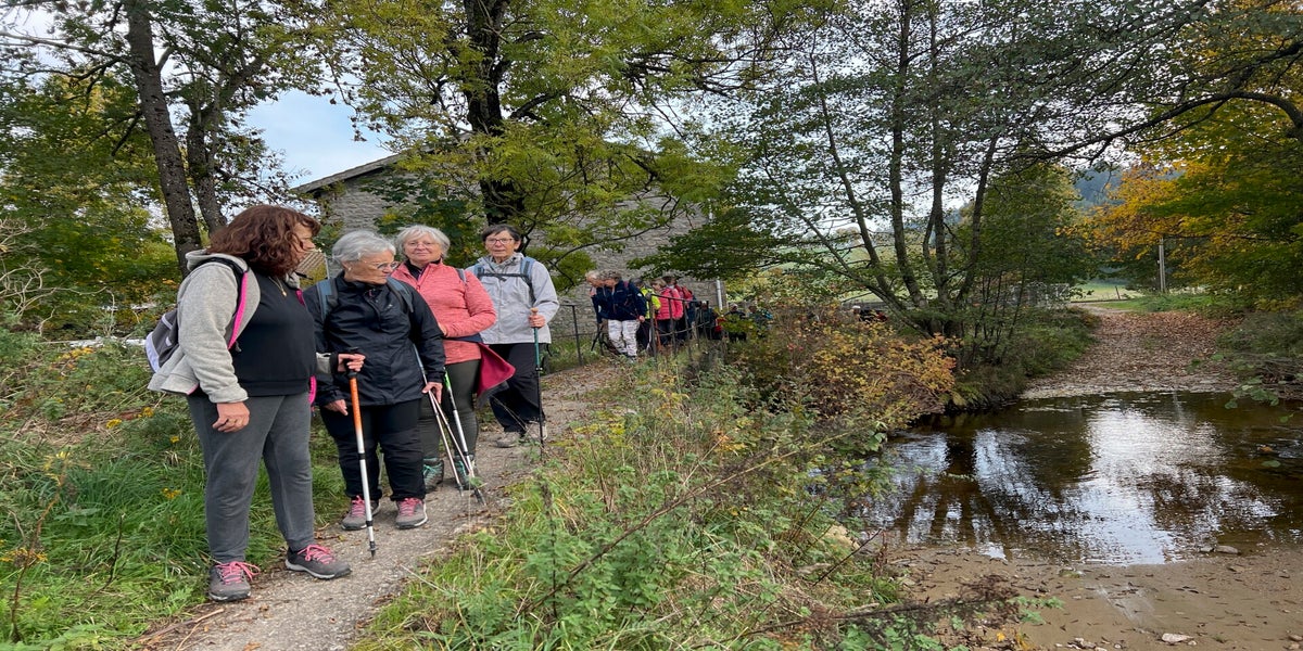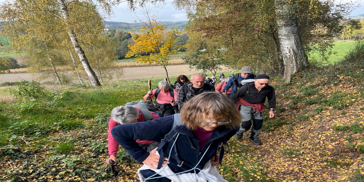 Cet après-midi, la randonnée à Jonzieux s’est déroulée sous un ciel joueur, où le soleil s’amusait à cache-cache derrière les nuages. Les chemins se paraient des teintes chaudes de l’automne : feuilles dorées, rouges et cuivrées tapissaient le sol, tandis que l’air frais portait ce parfum caractéristique de sous-bois humide.