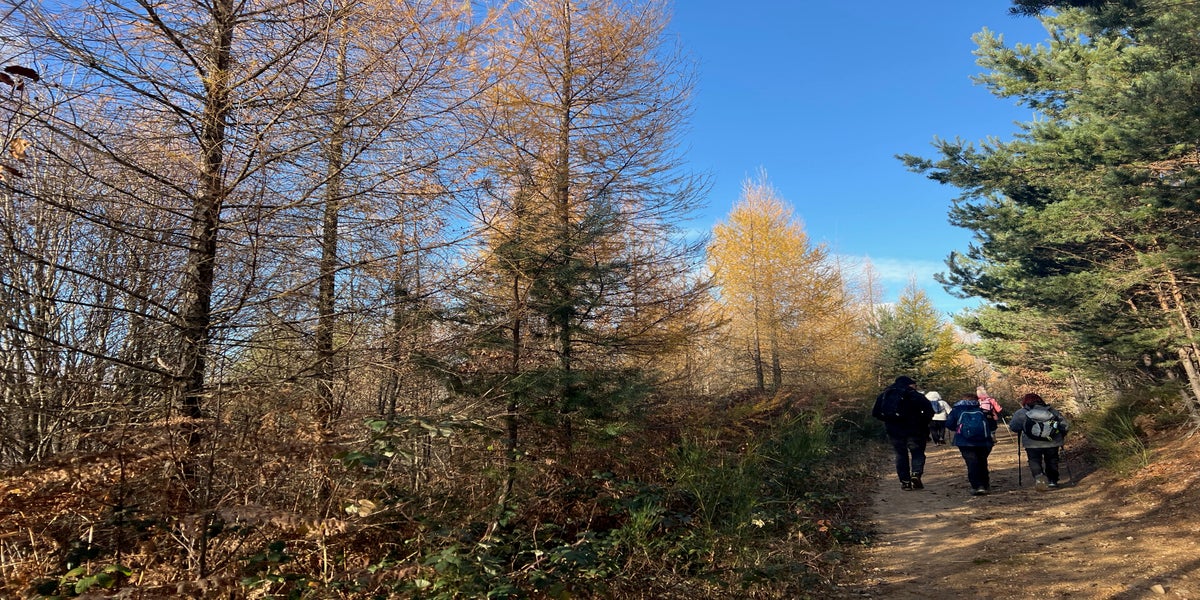 Les 13 kilomètres du parcours se sont ainsi déroulés dans une atmosphère dynamique, portée par une belle harmonie entre les marcheurs. Malgré le froid persistant, la lumière automnale nous enveloppait doucement. Elle se reflétait avec éclat sur les mélèzes en pleine flamboyance et sur les dernières feuilles encore accrochées aux branches, offrant un spectacle lumineux et chaleureux.